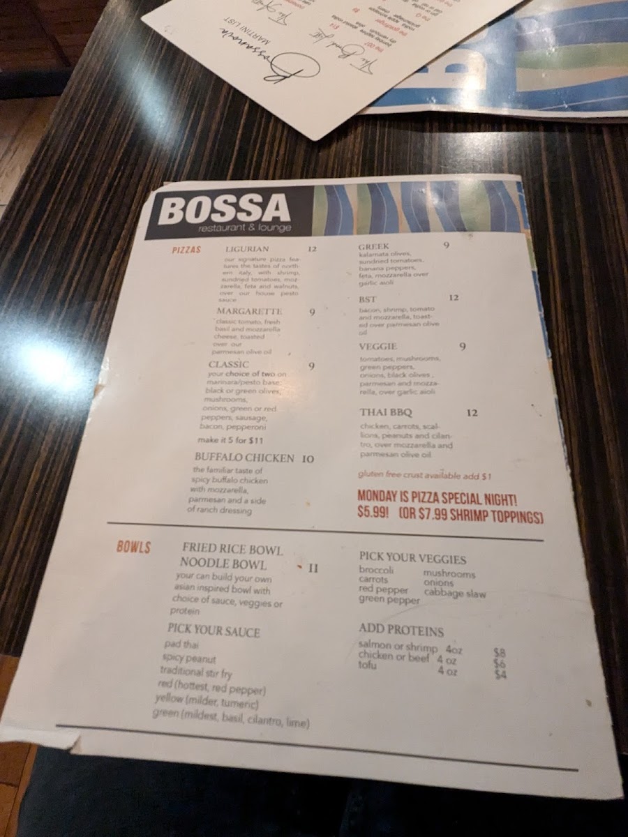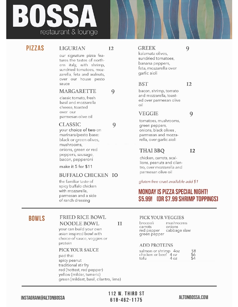 your choice of two on marinara/pesto base: black or green olives, mushrooms, onions, green or red peppers, sausage, bacon, pepperoni